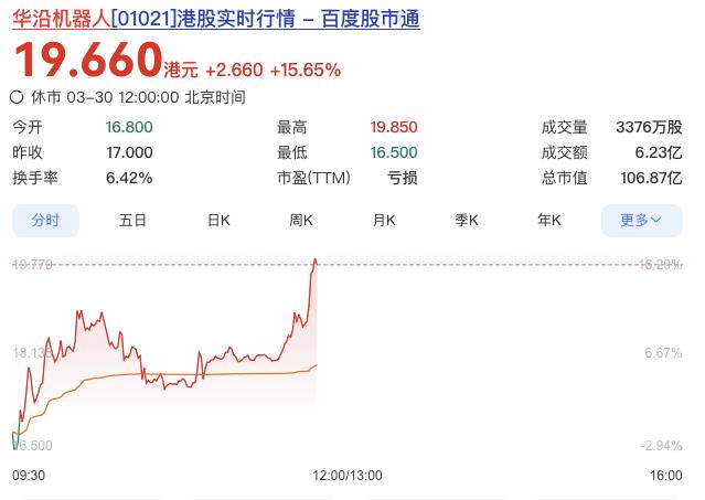 截至午间休市,华沿机器人涨15.65%报19.66港元,总市值106.87亿港元。