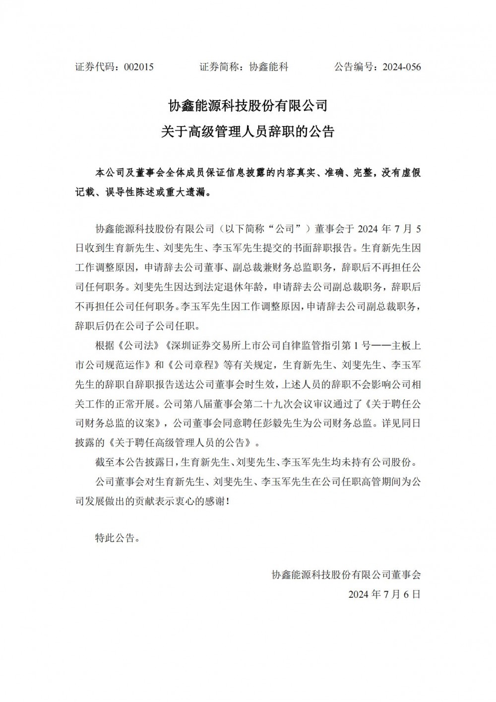 国际能源网获悉,7月5日晚间,协鑫能科发布关于高级管理人员辞职的公告。