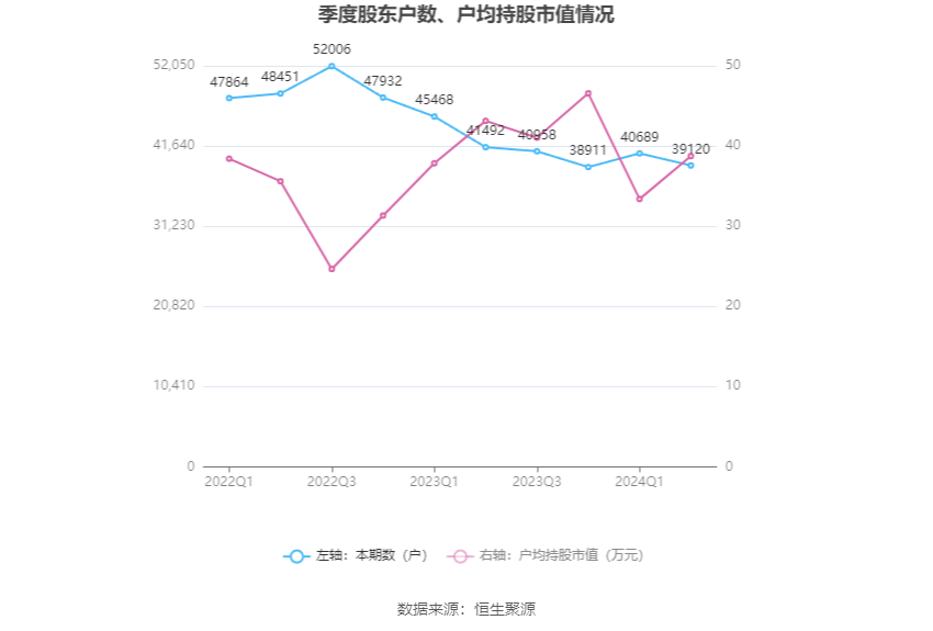 筹码集中度方面,截至2024年上半年末,公司股东总户数为3.91万户,较一季度末下降了1569户,降幅3.86%;户均持股市值由一季度末的33.39万元上升至38.74万元,增幅为16.02%。