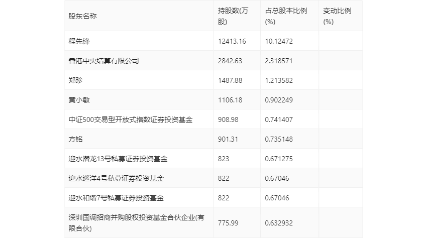 半年报显示,2024年上半年末公司十大流通股东中,持股最多的为程先锋,占比10.12%。十大流通股东名单相比2024年一季报维持不变。在具体持股比例上,郑珍、中证500交易型开放式指数证券投资基金持股有所上升,香港中央结算有限公司持股有所下降。