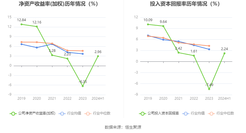 数据显示,2024年上半年公司加权平均净资产收益率为2.96%,较上年同期增长1.76个百分点;公司2024年上半年投入资本回报率为2.24%,较上年同期增长1.27个百分点。