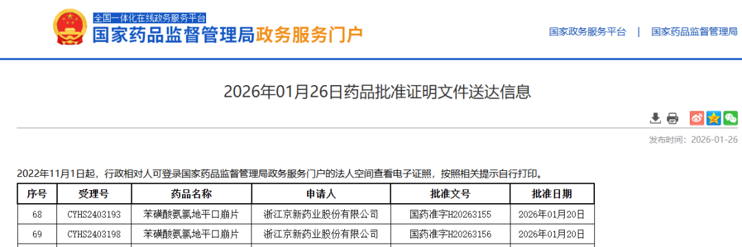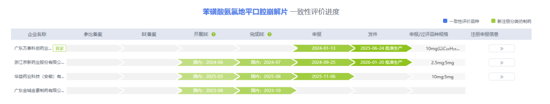 1月19日-1月25日期间,共56个品种通过/视同通过一致性评价。同期,53个品种申报一致性评价。01浙江京新:苯磺酸氨氯地平口崩片近日,国家药监局官网显示,浙江京新药业的苯磺酸氨氯地平口腔崩解片获批上市,视同通过一致性评价。 这意味着,在广东万泰科创2025年6月拿下该剂型“首仿+首家过评”后,京新药业成为国内第二家拥有该剂型批文的企业。 图片来源:NMPA 官网苯磺酸氨氯地平,这个由辉瑞研发的第三代钙离子拮抗剂(络活喜),自上市以来一直是降压药市场的“定海神针”。根据药智数据显示,该品种在 2024 年国内销售额已接近 70 亿元。 ▲苯磺酸氨氯地平国内销售趋势图片来源:药智数据-药品全终端销售分析系统但在高销售额的背后,是极度内卷的竞争格局。截至目前,苯磺酸氨氯地平片(普通片剂)已有 95 个上市批件。早在2018年,该品种就被纳入“4+7”带量采购。京新药业正是当年的中标企业,通过一致性评价并以低价换取了巨额市场准入。数据显示,苯磺酸氨氯地平片剂占据了整个分子市场份额的98.5%以上。 ▲苯磺酸氨氯地平国内上市批件数量分布图片来源:药智数据-中国上市药品这种“一家独大”的剂型结构,意味着留给分散片、胶囊、滴丸等其他剂型的生存空间微乎其微。对于新入局者而言,普通片剂市场已无异于“死海”,唯有技术壁垒相对较高的新剂型,才有一线生机。在众多改良剂型中,口腔崩解片(ODT)因其无需用水、入口即化的特性,在高龄老人、吞咽困难患者及精神类患者中具有不可替代的临床价值。此前,该细分赛道一直由广东万泰科创领跑,而昨日浙江京新药业的获批,成为该品种第二家视同过评企业,使其形成了“普药截流+高端补位”的产品矩阵,能够同时覆盖院内基础市场和院外特需市场。 图片来源:药智数据-一致性评价进度红海的苯磺酸氨氯地平市场,已从“拼价格”进入“拼创新”阶段。但创新不是盲目堆砌剂型,而是基于真实临床需求的价值重构。口崩片的获批,标志着该品种竞争进入2.0时代:企业需在“集采保量”与“创新溢价”间寻找平衡。02一致性评价通过情况1月19日-1月25日期间,共56个品种通过/视同通过一致性评价。具体情况如下:表1:通过一致性评价的品种 表2:视同通过一致性评价的品种 03一致性评价受理情况1月19日-1月25日期间,共53个品种申报一致性评价,具体情况如下:表3:一致性评价申报情况 数据来源:药智数据-仿制药一致性评价分析系统