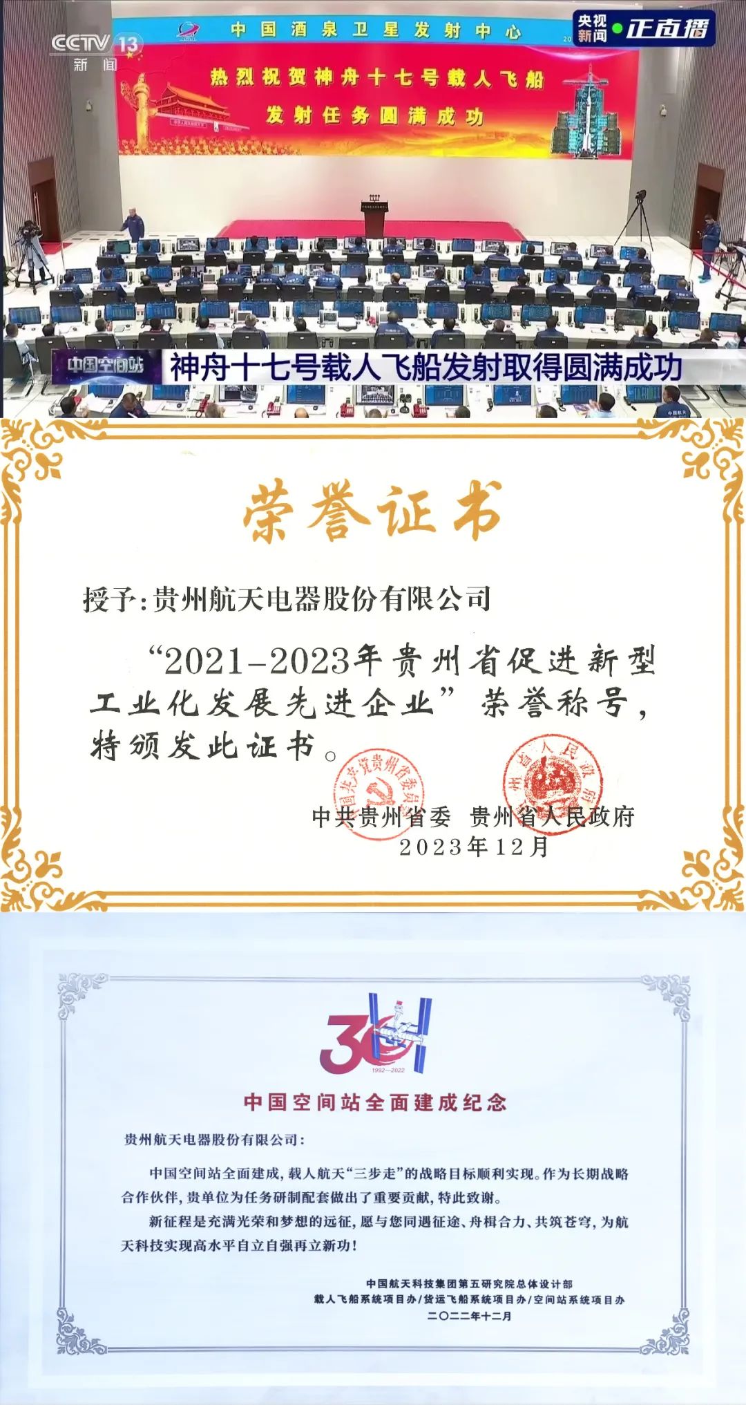 坚定坚决贯彻落实国家重大战略,助力神舟十六号、十七号载人飞船,天舟六号货运飞船等发射任务取得圆满成功。推进光学舱、新一代飞船、探月工程等国家重大工程项目以及武器装备配套保障任务。公司荣获中国空间站全面建成纪念奖、多人获得嫦娥五号等国家重大任务表彰。落实国家科技创新引领、产业体系建设重大规划,聚焦优势专业积极布局国家重点新产业、国家重大科技任务论证、攻关,得到装备发展部、工信部、发改委等国家部委认可和支持,国家级项目立项取得新突破。获评“2021-2023年度贵州省促进新型工业化发展先进企业、先进单位”、贵州省国防科技工业型号攻坚立功竞赛成绩突出集体,贵州省重点排污单位环境信用评价A级等荣誉。