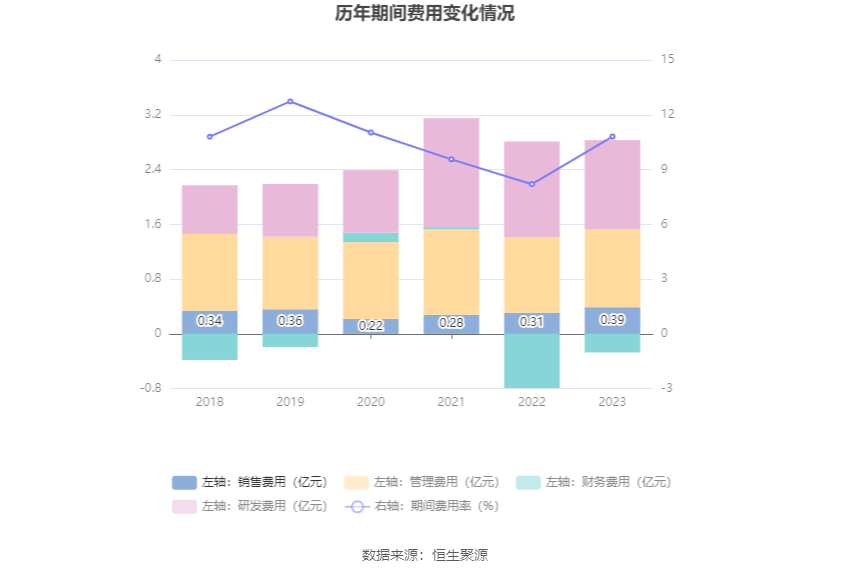 2023年,公司期间费用为2.56亿元,较上年同期增加5363.41万元;期间费用率为10.81%,较上年同期上升2.61个百分点。其中,销售费用同比增长24.65%,管理费用同比增长3.81%,研发费用同比下降7.37%,财务费用由去年同期的-7896.39万元变为-2683.79万元。