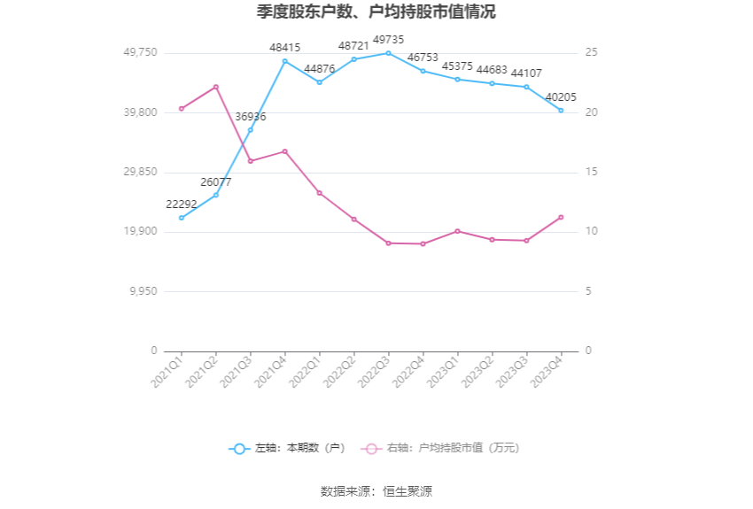 筹码集中度方面,截至2023年年末,公司股东总户数为4.02万户,较三季度末下降了3902户,降幅8.85%;户均持股市值由三季度末的9.29万元上升至11.25万元,增幅为21.10%。