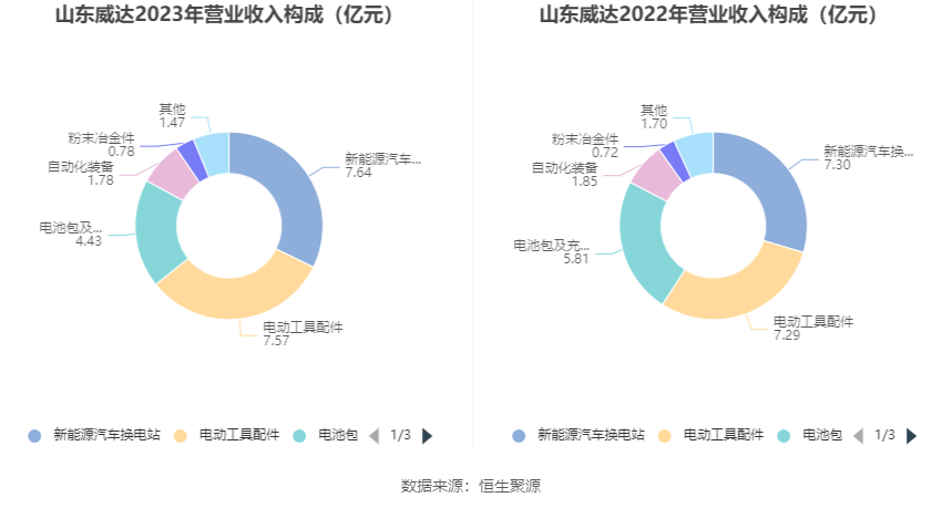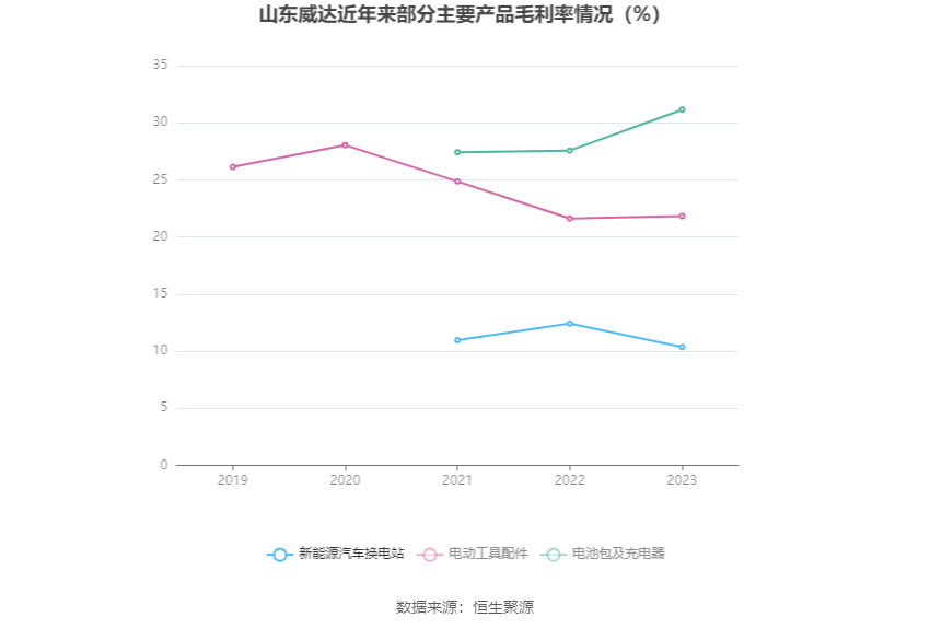 分产品看,新能源汽车换电站、电动工具配件、电池包及充电器2023年毛利率分别为10.35%、21.83%、31.15%。