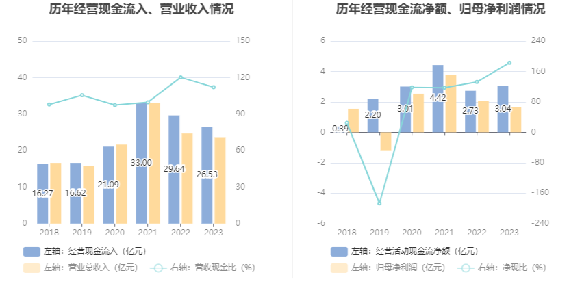2023年,公司营业收入现金比为112.08%,净现比为182.78%。