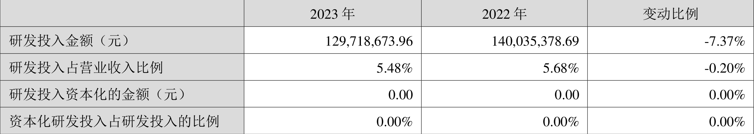 2023年全年,公司研发投入金额为1.30亿元,同比下降7.37%;研发投入占营业收入比例为5.48%,相比上年同期下降0.20个百分点。此外,公司全年研发投入资本化率为0。