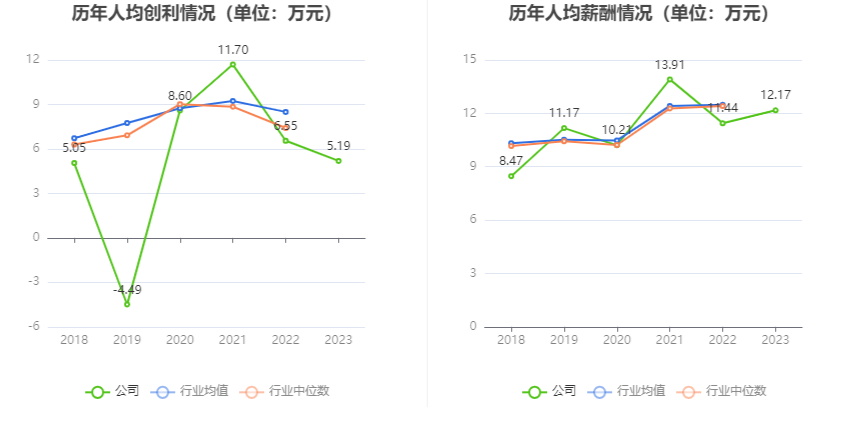 截至2023年末,公司员工总数为3203人,人均创收73.91万元,人均创利5.19万元,人均薪酬12.17万元,较上年同期分别变化-5.64%、-20.71%、6.39%。
