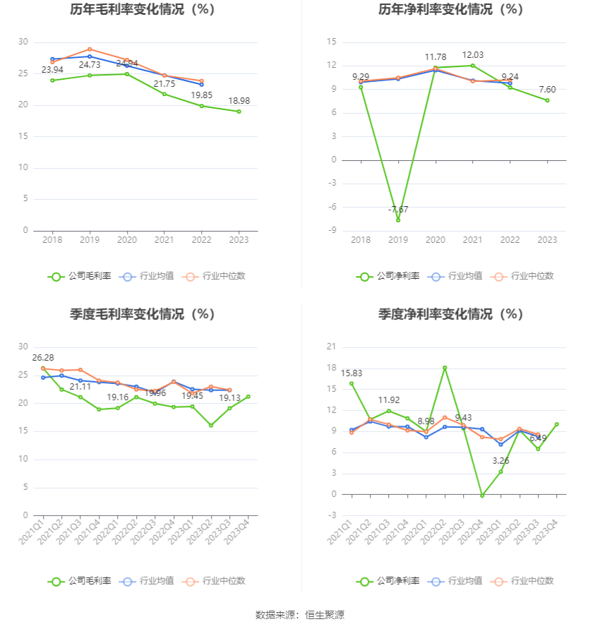 2023年,公司毛利率为18.98%,同比下降0.87个百分点;净利率为7.60%,较上年同期下降1.64个百分点。从单季度指标来看,2023年第四季度公司毛利率为21.21%,同比上升1.86个百分点,环比上升2.08个百分点;净利率为10.02%,较上年同期上升10.17个百分点,较上一季度上升3.53个百分点。