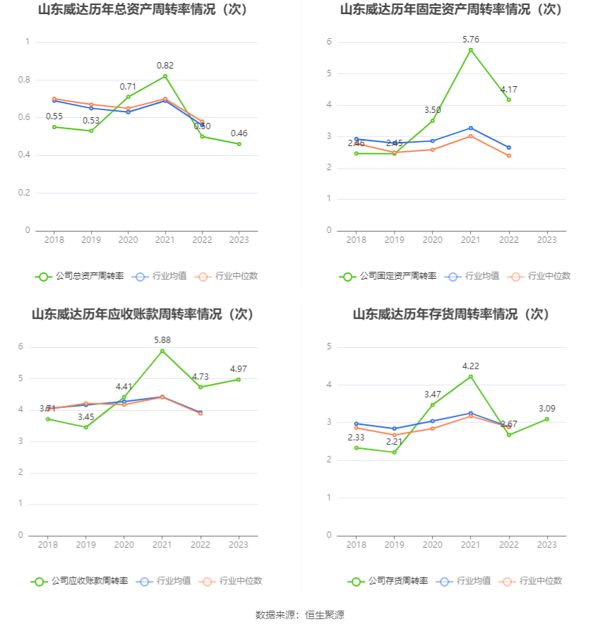 营运能力方面,2023年,公司公司总资产周转率为0.46次,上年同期为0.50次(2022年行业平均值为0.56次,公司位居同行业51/78);公司应收账款周转率、存货周转率分别为4.97次、3.09次。