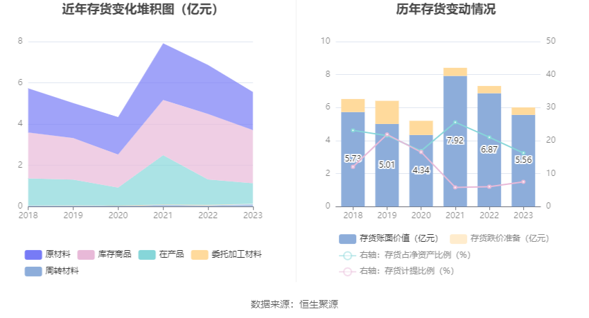 从存货变动来看,截至2023年年末,公司存货账面价值为5.56亿元,占净资产的16.25%,较上年末减少1.32亿元。其中,存货跌价准备为4520.99万元,计提比例为7.52%。
