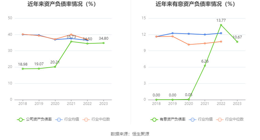 在偿债能力方面,公司2023年年末资产负债率为34.80%,相比上年末上升0.30个百分点;有息资产负债率为10.67%,相比上年末下降3.10个百分点。