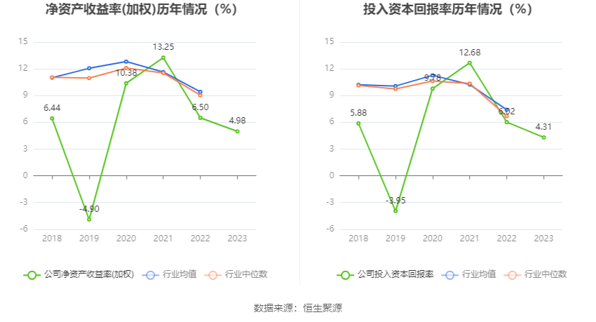 数据显示,2023年公司加权平均净资产收益率为4.98%,较上年同期下降1.52个百分点;公司2023年投入资本回报率为4.31%,较上年同期下降1.71个百分点。