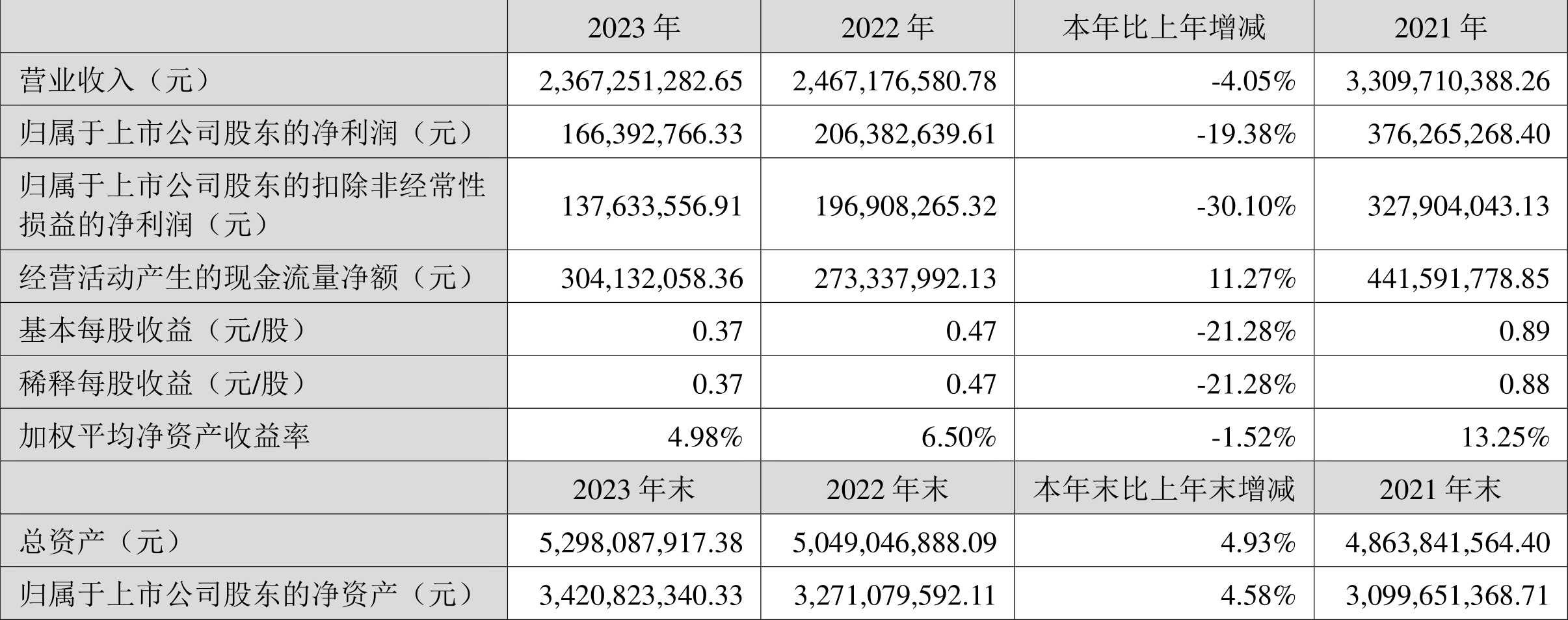 山东威达(002026)4月23日披露2023年年报。2023年,公司实现营业总收入23.67亿元,同比下降4.05%;归母净利润1.66亿元,同比下降19.38%;扣非净利润1.38亿元,同比下降30.10%;经营活动产生的现金流量净额为3.04亿元,同比增长11.27%;报告期内,山东威达基本每股收益为0.37元,加权平均净资产收益率为4.98%。