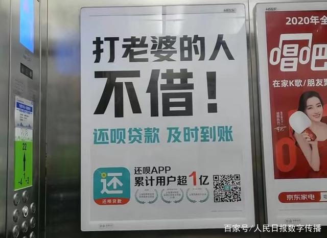 还呗通过分众传媒投放了楼宇广告,“打老婆的人不借,不打老婆的即时到账。”的广告语引起了网友的强烈反感。对此,有网友表示,有些社会议题应当被严肃对待,人们提到这些议题时抱有的情绪应该是对受害者的同情、对问题本身的反思和对伤害行为的痛斥,而不是把这些东西放在商业广告里抖机灵。