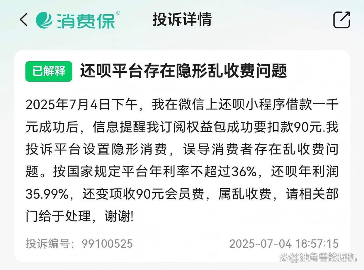 7月4日,一位用户反映在微信上还呗小程序借款一千元成功后,信息提醒他订阅权益包成功要扣款90元,他投诉平台设置隐性消费,误导消费者存在乱收费问题。