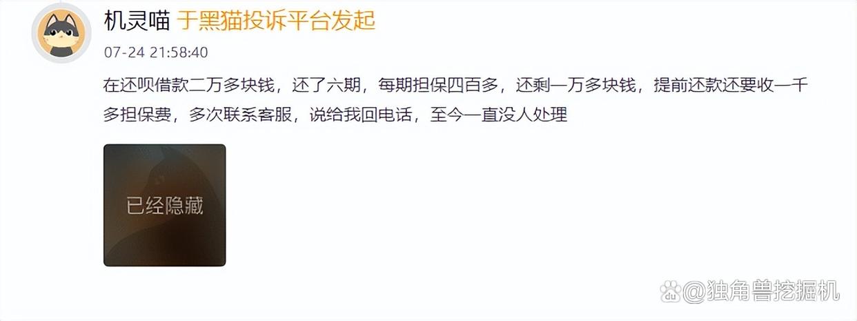 7月24日,一位用户反映在还呗借款2万多元,每期担保费就有400多元,提前还款还要收1000多的担保费。