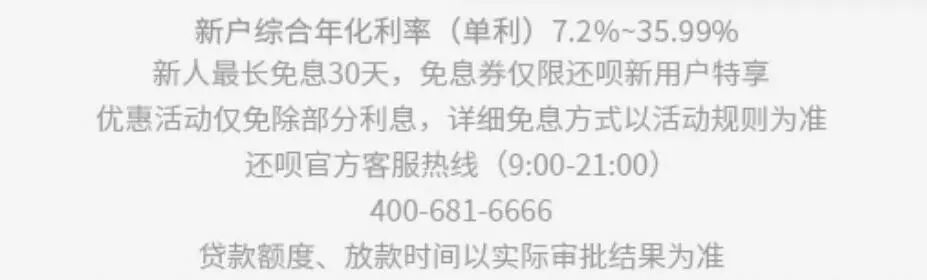 还呗官网显示,新户综合年化利率(单利)7.2%-35.99%。