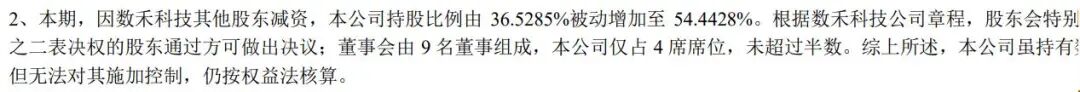 综上所述,本公司虽持有数禾科技 54.4428%的股权,但无法对其施加控制,仍按权益法核算。