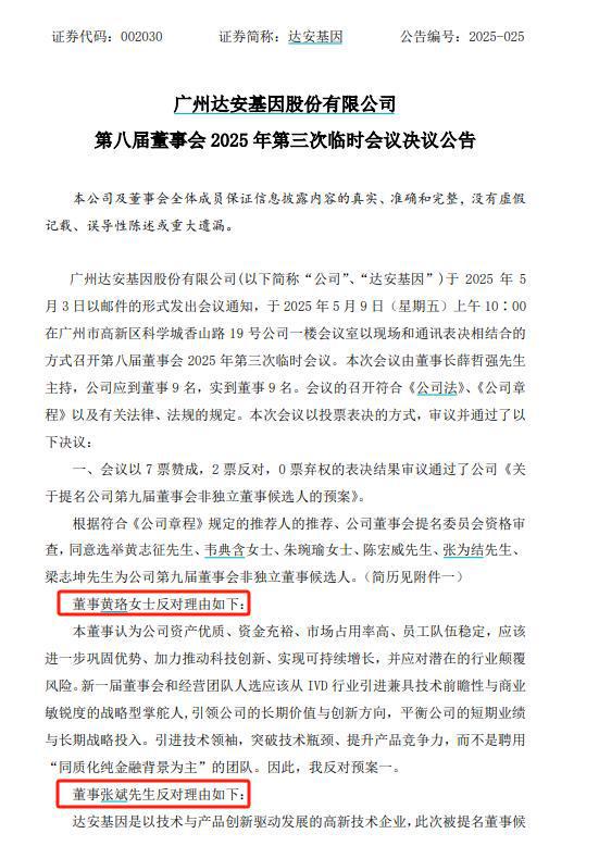 今年5月,黄珞、张斌曾对达安基因司《关于提名公司第九届董事会非独立董事候选人的预案》投反对票。