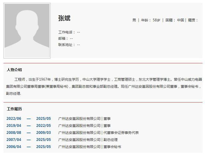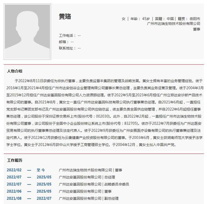 简历显示,黄珞、张斌、龙潜均有中山大学学历背景。人物库资料显示,黄珞在2004年3月至2015年12月担任广州达安基因股份有限公司人力资源部经理;2021年6月起,主要负责全国供应链管理。张斌在2006年4月至2025年5月期间任达安基因董秘一职,任职时间将近20年。