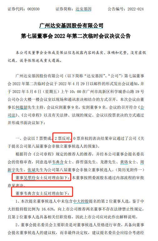 值得注意的是,2022年5月,达安基因就曾上演过针对董事候选人名单的角力戏码,只是当时投下反对票的是韦典含和吴翠玲。
