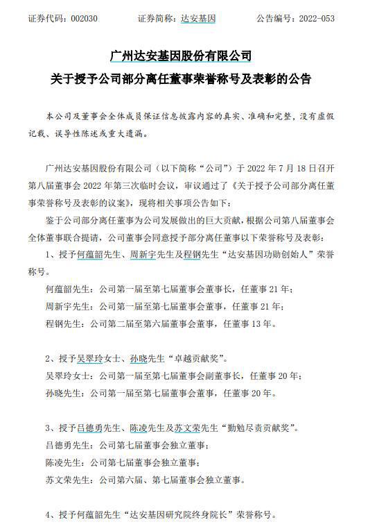 达安基因表示,鉴于公司部分离任董事为公司发展做出的巨大贡献,根据公司第八届董事会全体董事联合提请,公司董事会同意授予部分离任董事以下荣誉称号及表彰: