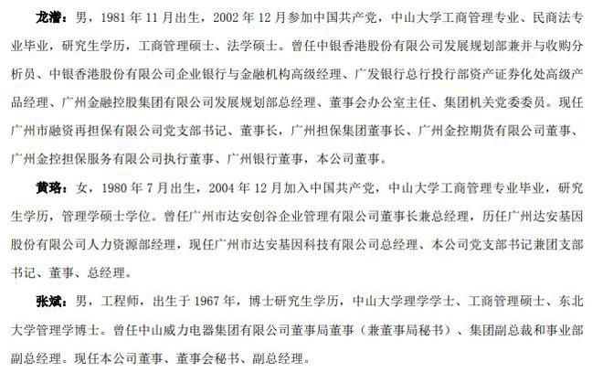 董事会成员方面,董事长韦典含,副董事长陈宏威,非独立董事朱琬瑜、黄志征均有广州金控集团背景。张斌、黄珞等均任期届满离任。