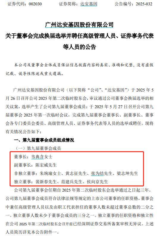 达安基因还表示,因任期届满,薛哲强不再担任公司董事长、非独立董事及董事会专门委员会职务;黄珞不再担任公司非独立董事、总经理及董事会专门委员会职务;张斌不再担任公司非独立董事、董事会秘书;蒋析文不再担任公司非独立董事、副总经理;龙潜不再担任公司非独立董事及董事会专门委员会职务;独立董事计云海、朱征夫不再担任公司独立董事及董事会专门委员会职务。