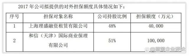 和信保理依上海理盛炮制,巨轮2017年4月为和信保理向广东粤财信托借款5亿元、向上海海德立业和上海国创投资借款0.3亿元连带责任担保,担保额度不超过2.5亿元和0.3 亿元。