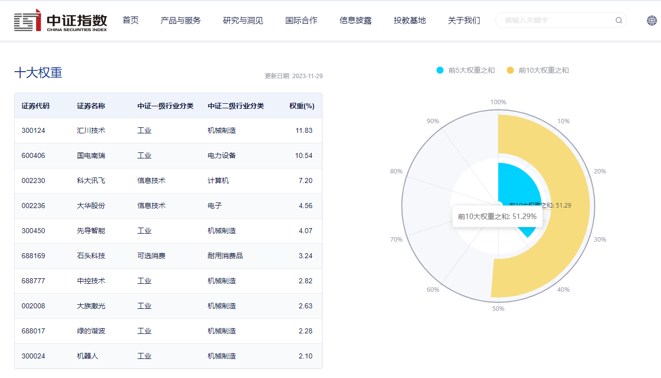 数据显示,截至2023年11月29日,该指数前十大权重股包括汇川技术、国电南瑞、科大讯飞、大华股份、先导智能等,前十大权重股合计占比约为51.29%。(数据来源:中证指数公司,指数成份股不代表个股推荐)