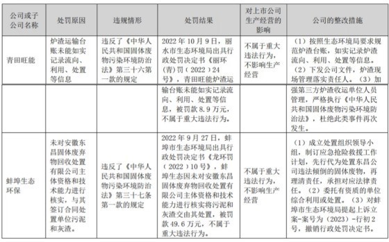 年报显示,旺能环境的全资子公司蚌埠生态环保、青田旺能因环境问题受到行政处罚。2022年9月27日,蚌埠市生态环境局对蚌埠生态环保出具了行政处罚决定书《龙环罚﹝2022﹞10 号》。因未对安徽东昌固体废弃物回收处置有限公司主体资格和技术能力进行核实就将污泥和灰渣交由其处置,蚌埠生态环保违反了《中华人民共和国固体废物污染环境防治法》第三十七条第一款的规定,被罚款49.6万元。此外,蚌埠市生态环境局还要求蚌埠生态环保采取相关整改措施。例如,成立处置组织领导小组,制订应急抢险救援工作计划,先行代为处置东昌公司违法倾倒的固体废物,再理清责任,承担对应法律责任;委托有资质的单位综合利用或处置。