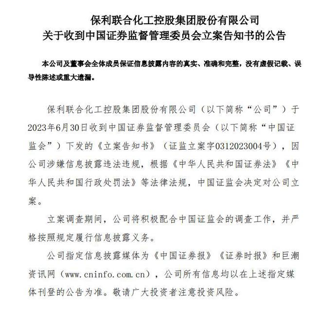 具体来看,保利联合化工控股集团股份有限公司于6月30日收到中国证券监督管理委员会下发的《立案告知书》,因公司涉嫌信息披露违法违规,根据《中华人民共和国证券法》《中华人民共和国行政处罚法》等法律法规,中国证监会决定对公司立案。