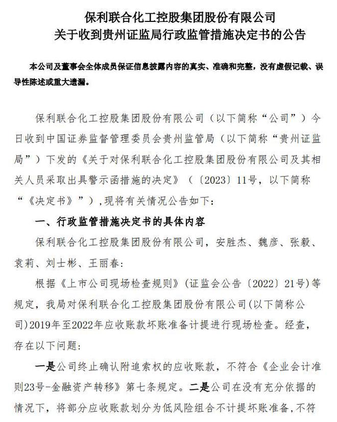 同日,保利联合还发布关于收到贵州证监局行政监管措施决定书的公告。决定书指出,根据《上市公司现场检查规则》等规定,贵州证监局对保利联合化工控股集团股份有限公司2019年至2022年应收账款坏账准备计提进行现场检查,包括: