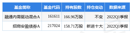根据2022Q1季报基金重仓股数据,重仓该股的基金共2家,其中持有数量最多的基金为融通内需驱动(161611)混合A。融通内需驱动混合A目前规模为8.78亿元,最新净值2.138(4月25日),较上一交易日下跌2.55%,近一年上涨4.5%。该基金现任基金经理为范琨。范琨在任的公募基金包括:融通成长30灵活配置混合A,管理时间为2021年7月20日至今,期间收益率为-11.36%。