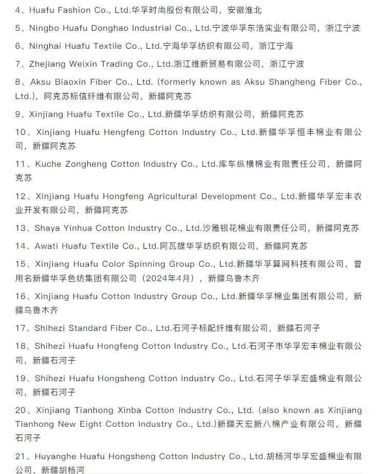 其中涉及到纺织行业的只有华孚时尚,不过针对的是华孚时尚及其25家子公司,这些公司拥有从新疆棉花种植、加工到纱线纺织的垂直整合供应链。其中22家子公司位于新疆,3家位于浙江省宁波市。FLETF基于具体和可表述的信息,认为这些实体从新疆采购棉花或棉制品。