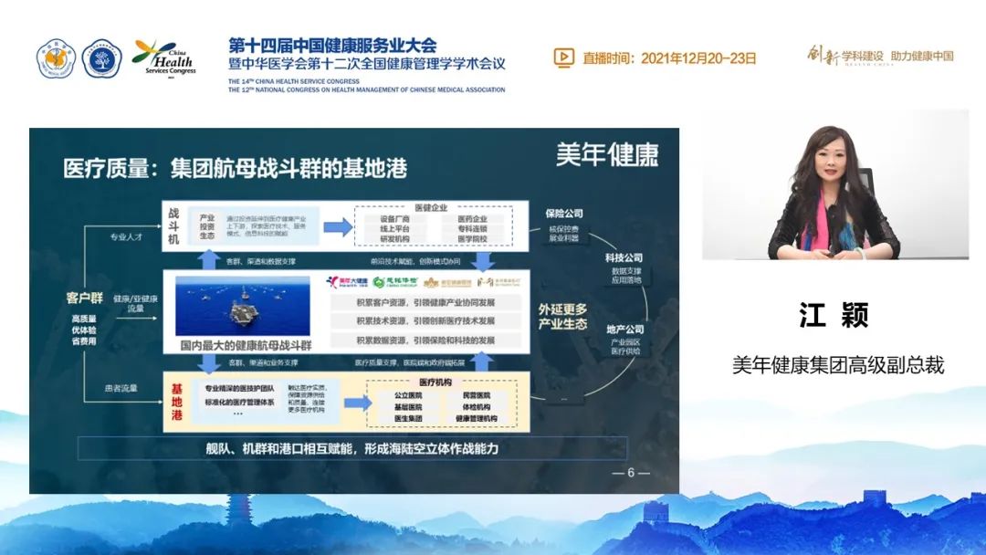 江颖首先强调,随着政策逐年发布、政府支持的力度逐年加强,中国健康行业正迈入市场需求持续增长的大时代。面对这样的大变局、大机遇,传统的健康体检行业逐步向“早筛查、早评估、早干预”的全周期健康管理发展,医疗质量成为核心竞争力。美年健康集团作为年体检量3000万人次的预防医学头部企业,以“医疗导向、品质驱动、服务支撑、创新引领”十六字方针为核心战略,依靠客户资源、技术资源、数据资源等,打造成为国内最大的健康航母战斗群,而医疗质量则是航母战斗群的基地港。