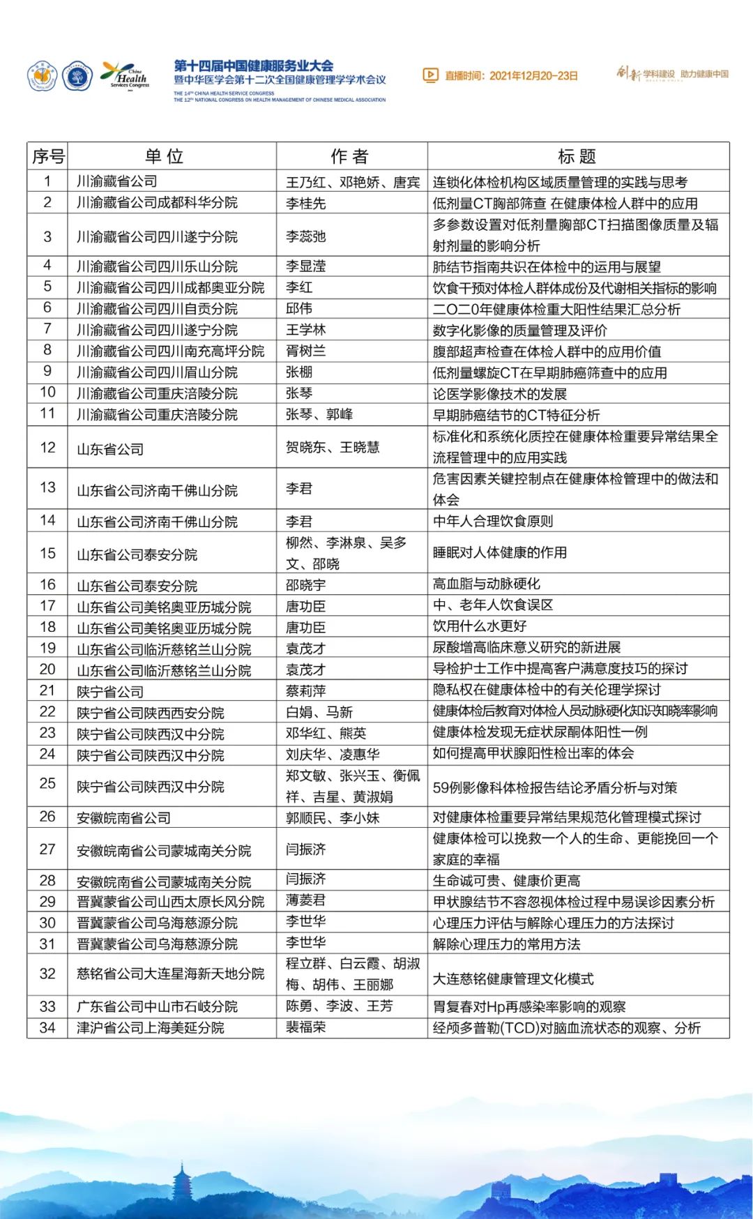 “第十四届中国健康服务业大会暨中华医学会第十二次全国健康管理学学术会议”于2021年12月20至23日以线上会议形式召开。大会以“创新学科建设、助力健康中国”为主题,围绕健康服务业和大健康产业发展的战略部署和重点问题,结合新冠肺炎疫情给我国健康服务业带来的挑战与机遇,深入交流探讨健康服务业和健康管理学科的实践路径和发展模式、健康管理服务体系的建立和完善、人才培养模式创新等热点问题,促进协同创新、加快成果转化,实现健康管理“防、管、服”工作的整体融合发展。