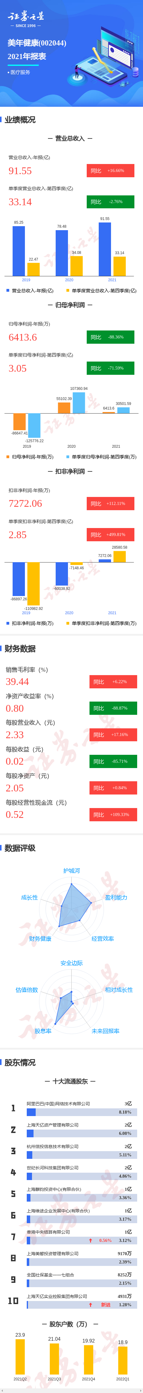 美年健康2021年报显示,公司主营收入91.56亿元,同比上升16.66%;归母净利润6413.6万元,同比下降88.36%;扣非净利润7272.06万元,同比上升112.11%;其中2021年第四季度,公司单季度主营收入33.14亿元,同比下降2.76%;单季度归母净利润3.05亿元,同比下降71.59%;单季度扣非净利润2.86亿元,同比上升499.81%;负债率53.55%,投资收益7019.49万元,财务费用3.48亿元,毛利率39.44%。