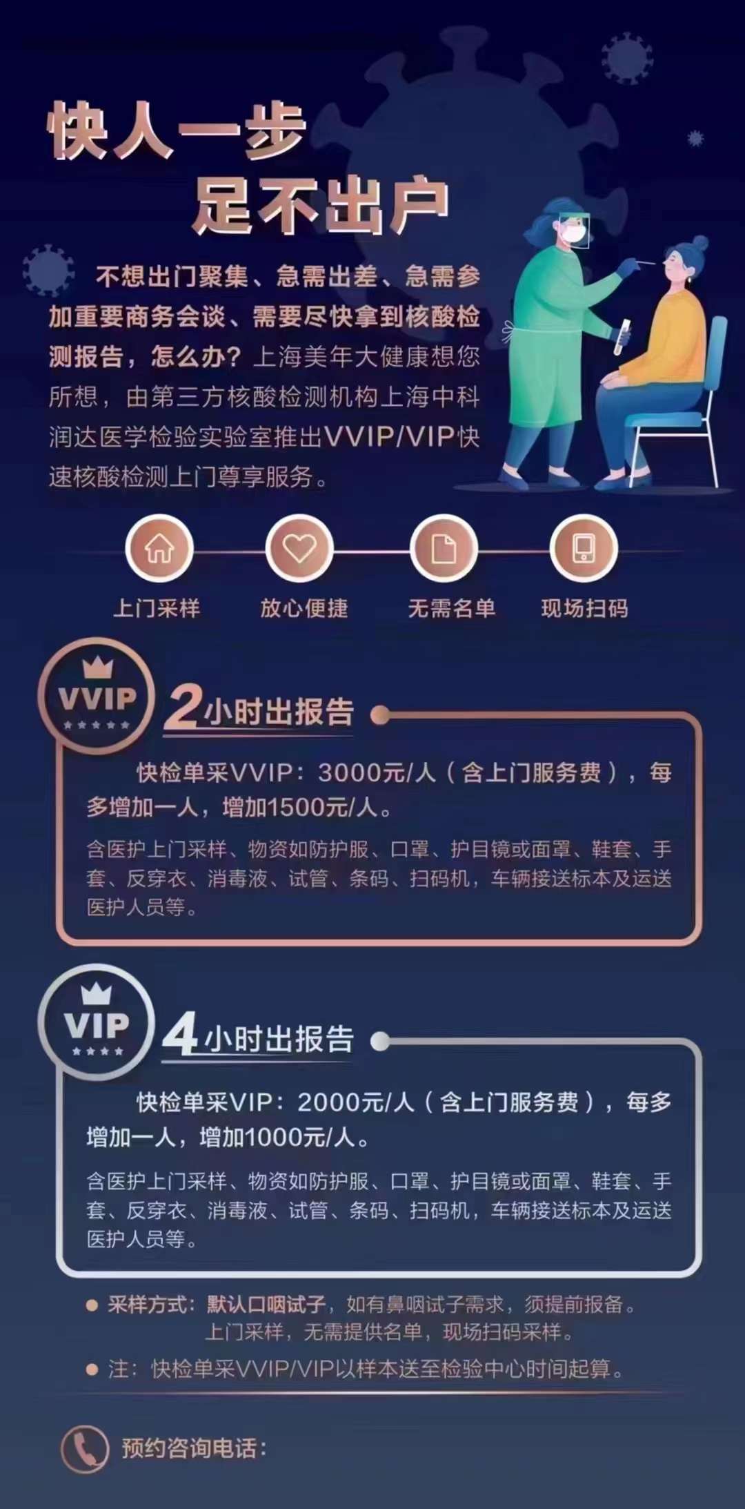 6月2日,一张核酸上门尊享服务的海报广泛流传,根据这张海报,上海美年大健康联合上海中科润达医学检验实验室推出VVIP/VIP快速核酸检测上门尊享服务,2小时出报告快检单采3000元/人,4小时出报告快检单采2000元/人。