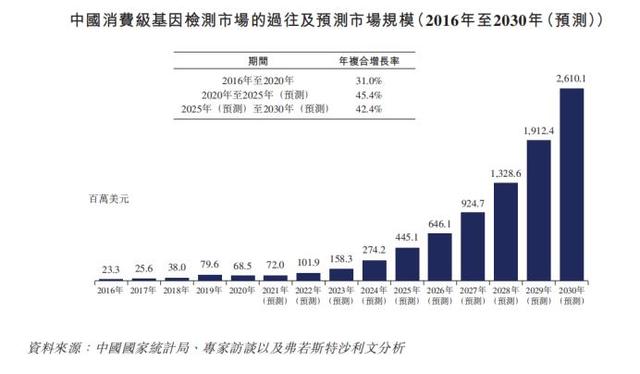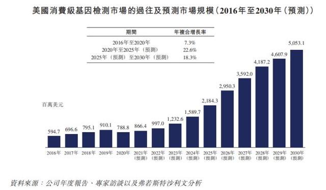 弗若斯特沙利文的资料显示,2020年美国消费级基因检测市场规模为7.89亿美元,预计2025年将增长为22亿美元。