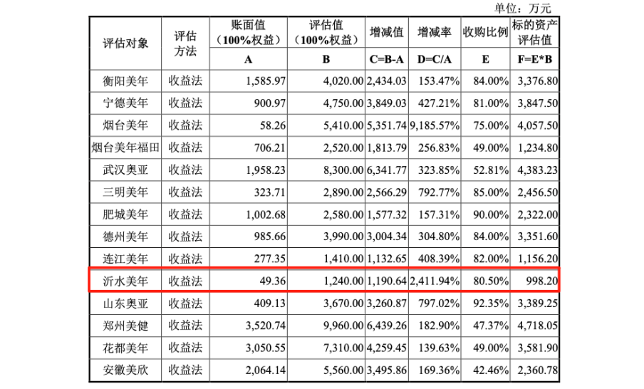 同样的情况发生在沂水美年身上,该公司2023年度净利润为-178.27万元,2024年也仅录得3.90万元的微薄利润。其截至评估基准日的账面净资产仅为49.36万元,却被评估出1,240.00万元 的高价,增值率达2,411.94%。