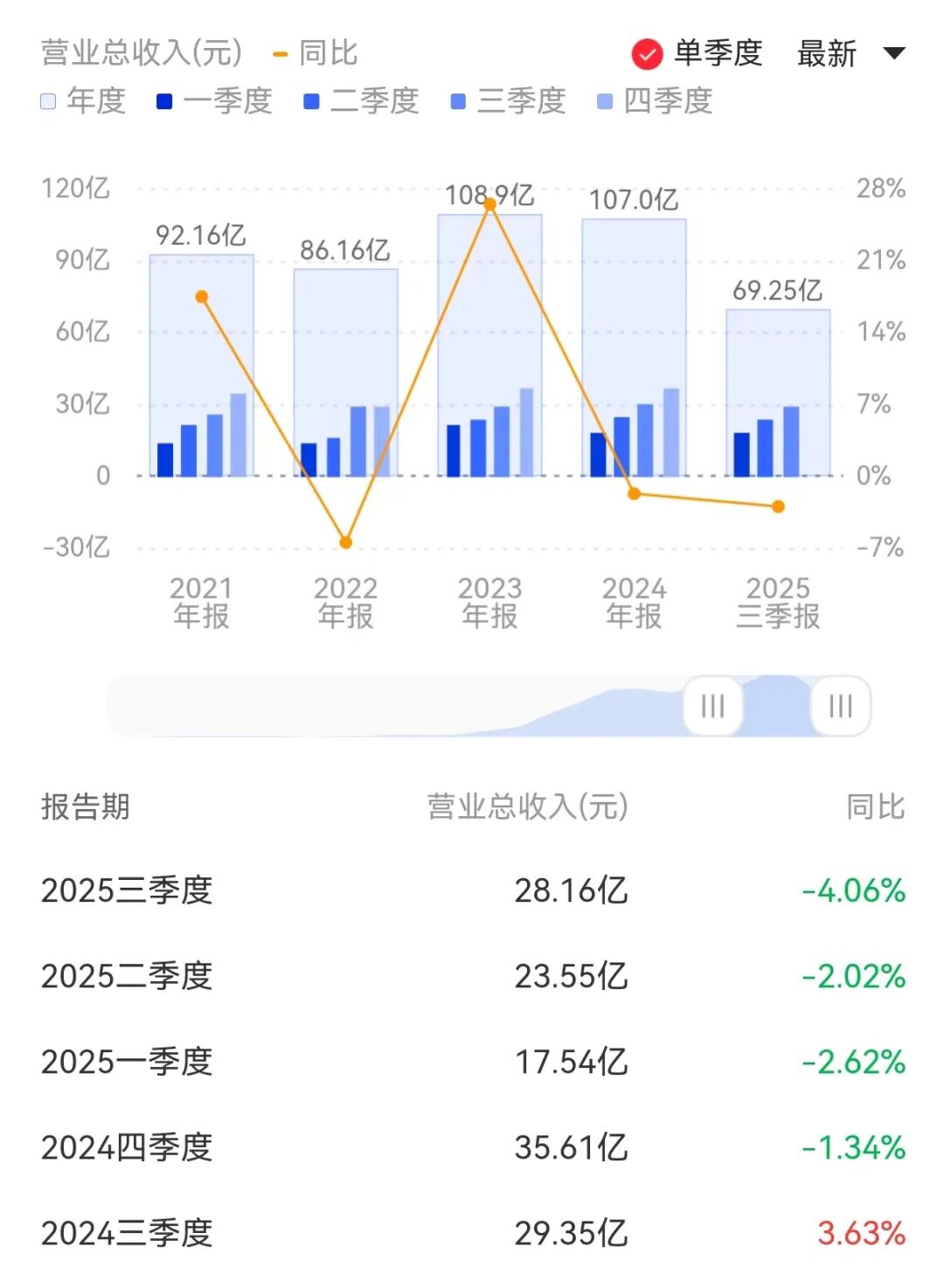 值得注意的是,自2024年第四季度以来,公司已连续四个季度单季营收同比下滑,分别下降1.34%、2.62%、2.02%和4.06%。