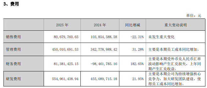 年报显示,费用方面,管理费用同比增加约10,723.17万元,主要是本期员工成本同比增加;研发费用同比增加约9,987.17万元,主要是本期公司为持续增强核心竞争力,加大研发团队建设,使得员工成本同比增加;财务费用同比增加约17,984.32万元,主要是本期受外币兑人民币汇率波动影响产生汇兑损失,上年同期产生汇兑收益。