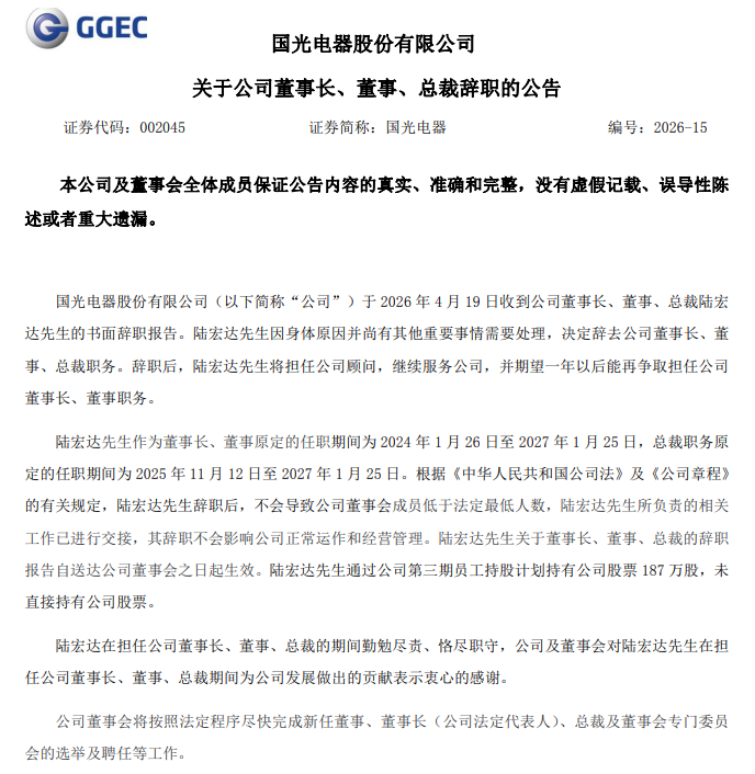 读创财经注意到,就在国光电器2025年年报和2026年一季报披露前夕,2026年4月20日早间,国光电器发布关于公司董事长、董事、总裁辞职的公告。
