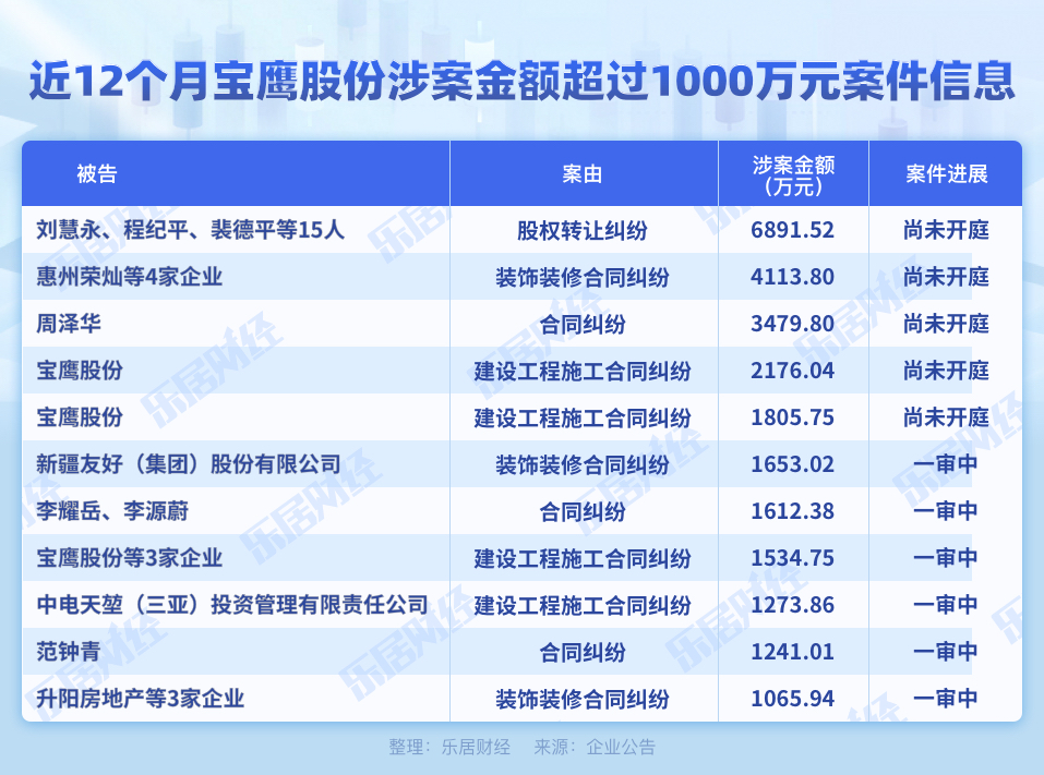 此外,宝鹰股份的股权转让纠纷虽然只有一条,但涉案金额在所有案件中最多,涉案金额为6891.52万元,宝鹰股份作为原告,刘慧永、程纪平、裴德平等15人为被告,该案件也尚未开庭。