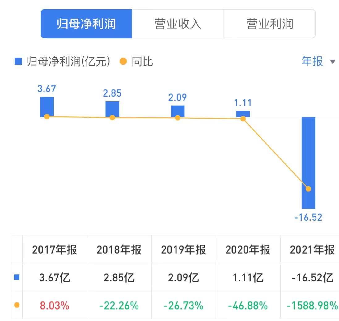 在应收账款和坏账激增之下,宝鹰股份的业绩开始出现了明显下滑。财报显示,2021年,宝鹰股份的营业收入为46.69亿元,同比下降21.59%,净利润为-16.52亿元,同比下降1588.98%。这是自2013年,宝鹰股份借壳上市后净利润出现首次亏损。