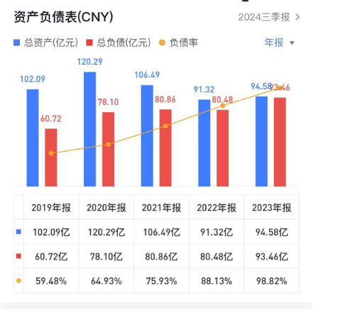 截至2023年年末,宝鹰股份负债率为98.82%。