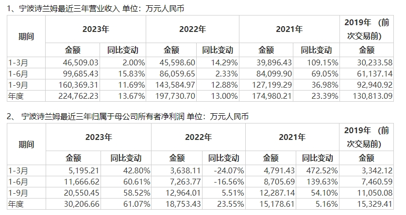 2019年、2021年、2022年和2023年,宁波诗兰姆的营业收入分别约13亿元、17.5亿元、19.77亿元和22.48亿元;归属于母公司所有者净利润分别约1.53亿元、1.52亿元、1.88亿元和3.02亿元。